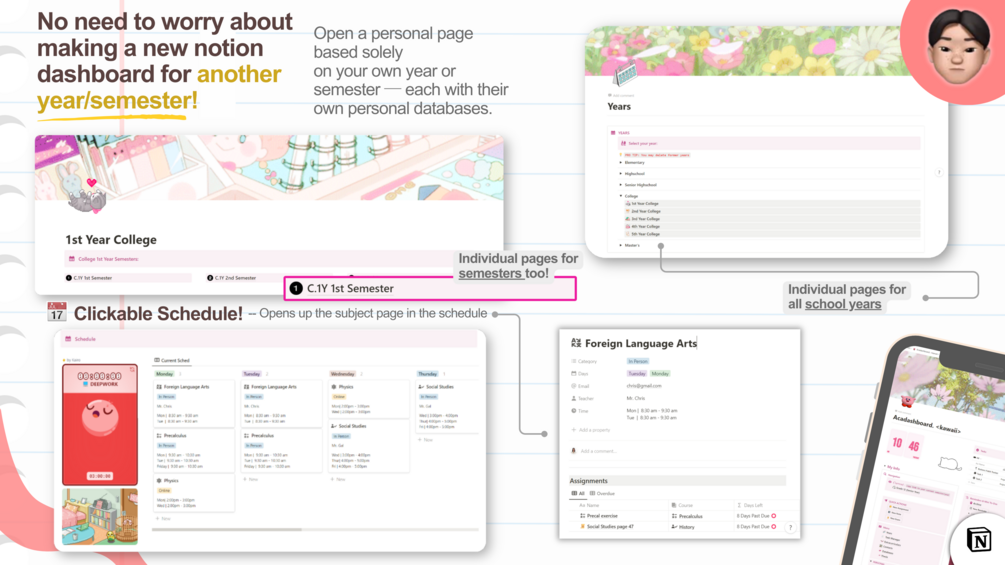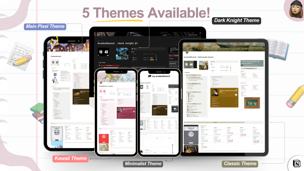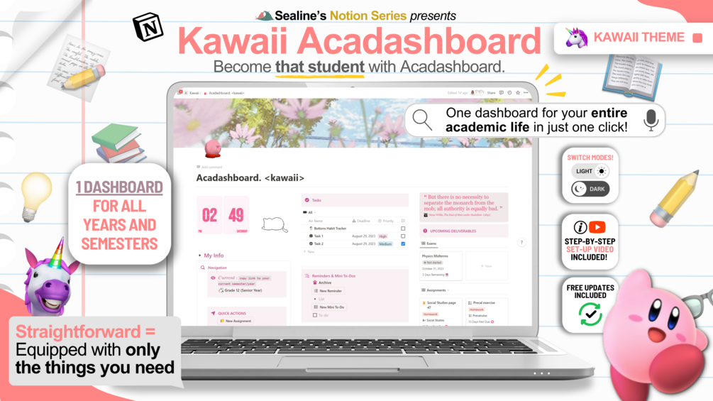 Pink Kawaii Theme Acadashboard 2023: Notion Student OS