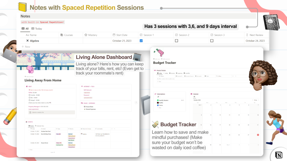 Using a student notion template will help you form a second brain for everything related to your academics. However, in our template, it's not only limited to your studies. We also cover other areas such as your personal life & even work if you're planning side hustles.