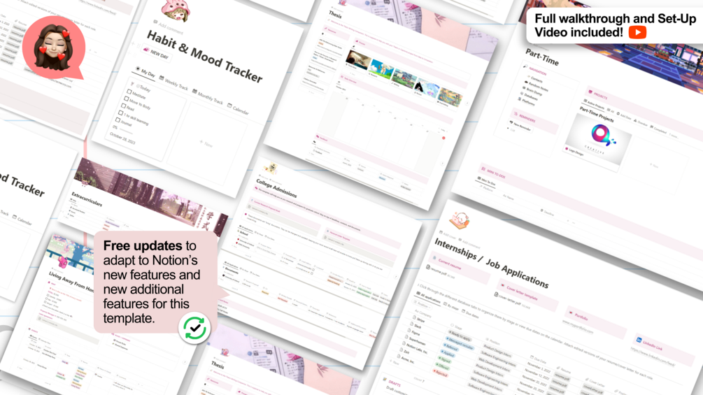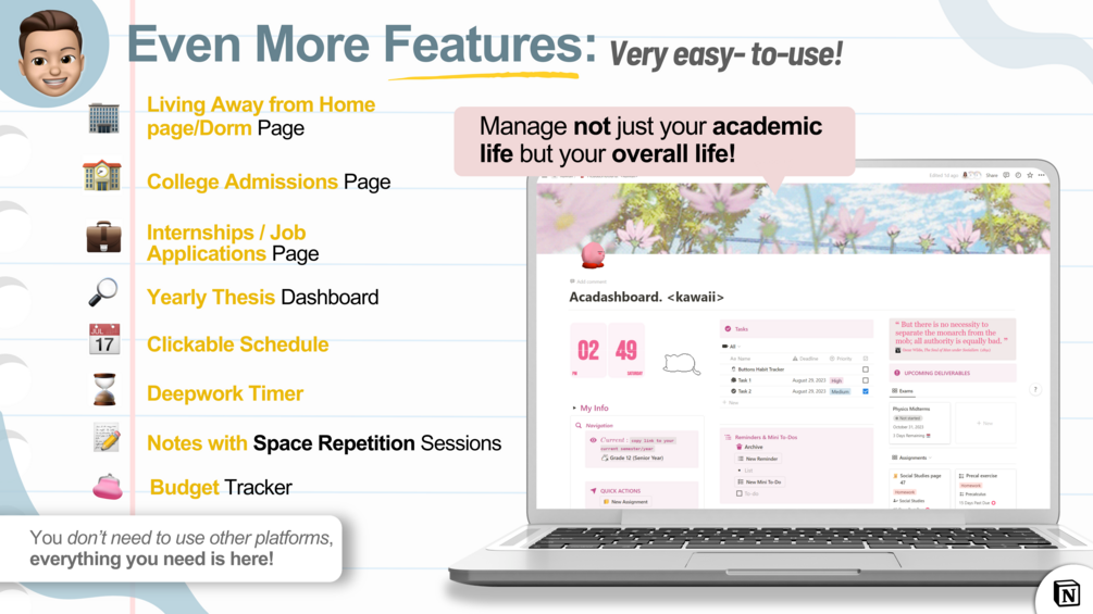 Get access to a notion template that manages everything school-related, from advanced habit trackers & to-do lists, to curated systems for individual years & semesters.